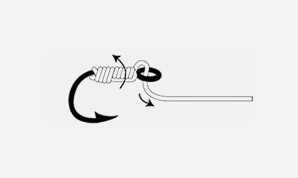 結び目を回転させて、ハリスがハリ先の反対側にくるように整える。ハリスの先端をカンにくぐらせ、ゆっくり引き締めて完成。